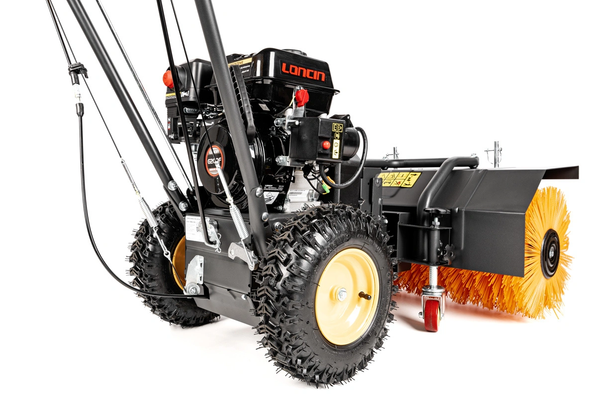 W zestawie znajduje się zamiatarka o szerokości 80cm wyposażona w silnik Loncin G200F z elektrycznym rozrusznikiem (silnik należy podłączyć do gniazda 230V i uruchomić za pomocą przycisku), lemiesz do odśnieżania, zbiornik na zamiatane nieczystości oraz pług wirnikowy czyli odśnieżarkę dwustopniową z ręcznie regulowanym deflektorem.