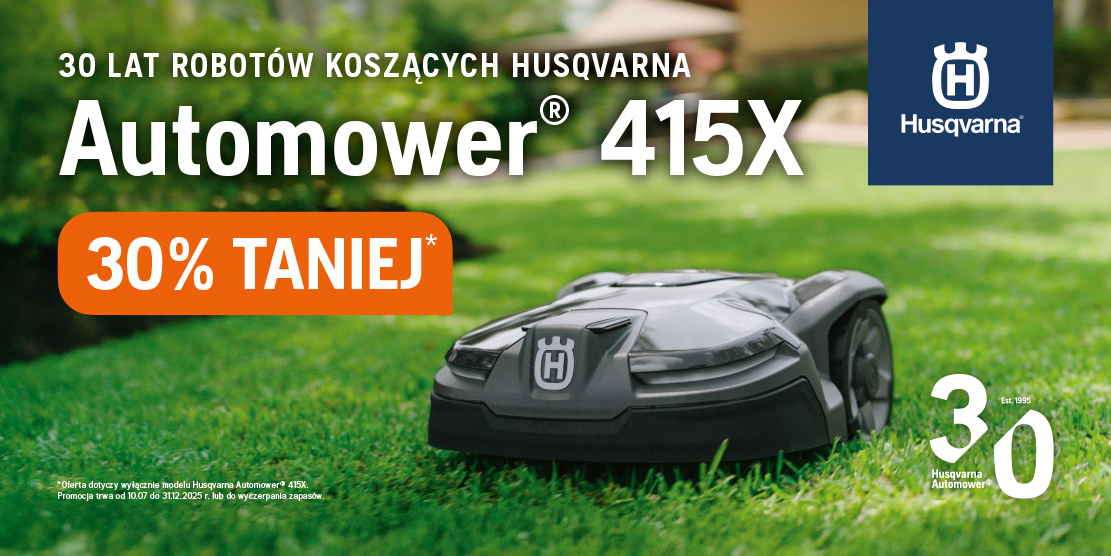 Husqvarna Automower® 415X — niezawodny i wydajny model z serii X-line, odpowiedni do trawników średniej wielkości. Kosi skomplikowane powierzchnie do 1500 m2, wyposażony w systemowe koszenie przejść, aby idealnie wykosić wąskie przejścia i z łatwością radzi sobie ze zboczami o nachyleniu do 40%. Bezproblemowa obsługa dzięki elektrycznej regulacji wysokości koszenia, funkcji TargetHeight, osłonie przeciwzamrożeniowej i regulatorowi pogodowemu. Łatwe czyszczenie i mycie wężem ogrodowym. Jako produkt z naszej oferty premium X-line, jest wyposażony w Automower® Connect z funkcją śledzenia GP Sw przypadku kradzieży i nawigacją ze wspomaganiem GPS, aby zapewnić Ci kontrolę, gdziekolwiek jesteś. Design X-line z reflektorami LED, przednim zderzakiem i specjalnymi kolorowymi kołpakami . Wyposażony również w FOTA (bezprzewodowe automatyczne aktualizacje oprogramowania).