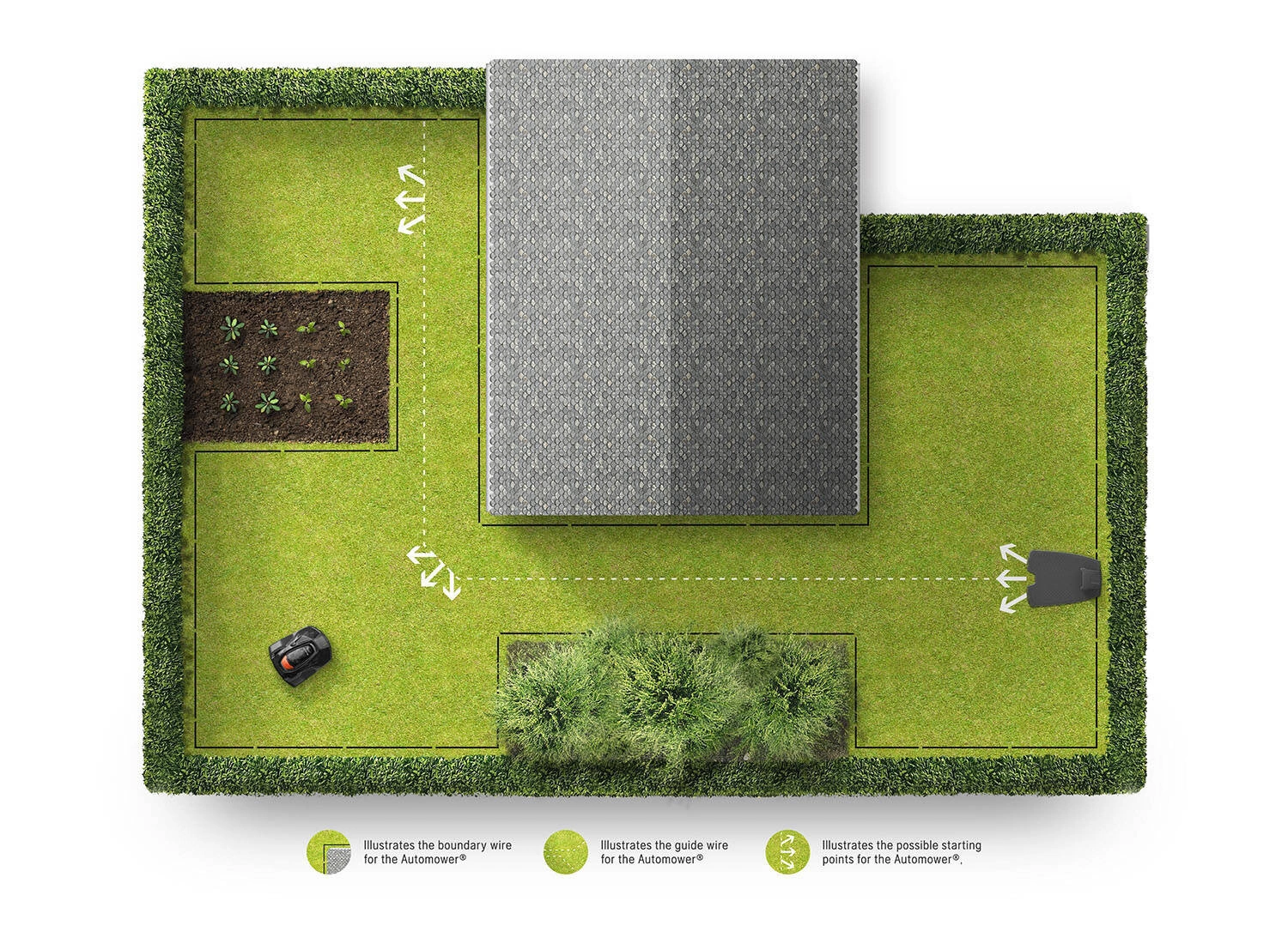 - 3 punkty rozpoczynania koszenia: Równomierny efekt koszenia na całym trawniku dzięki możliwości rozpoczęcia koszenia w trzech różnych miejscach wzdłuż opatentowanego przewodu ograniczającego, poza stacją ładującą. Im większa powierzchnia trawnika, tym bardziej przydatne róznie punkty rozpoczynania koszenia. Dzięki nawigacji GPS (wybrane modele), punkty rozpoczynania koszenia są ustawiane automatyczne i ręczne ustawienia nie są potrzebne.