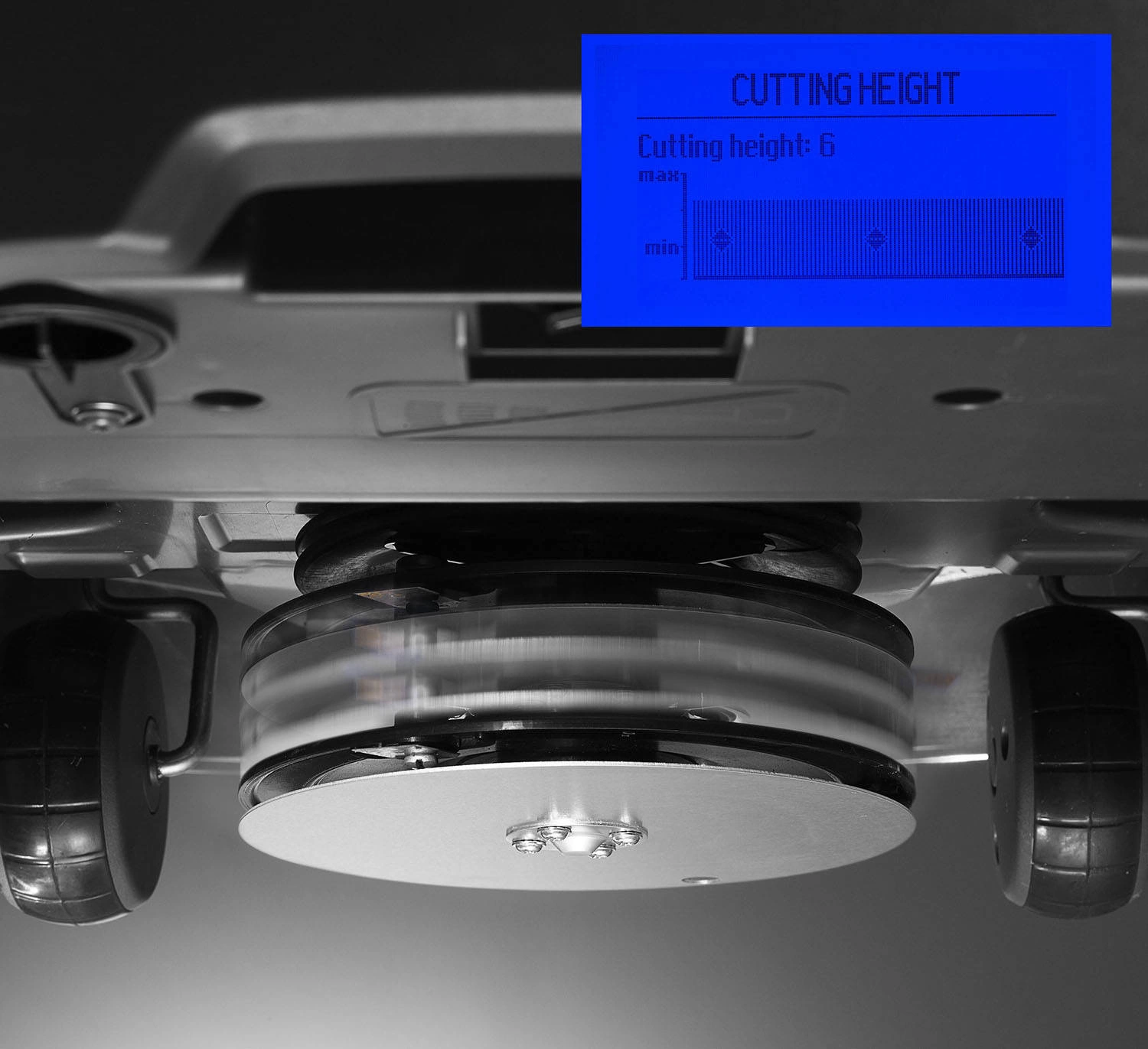 - Elektryczna regulacja wysokości koszenia: Wysokość koszenia może być szybko ustawiona poprzez elektrycznie sterowaną regulację wysokości koszenia, łatwo dostępną w głównym menu.