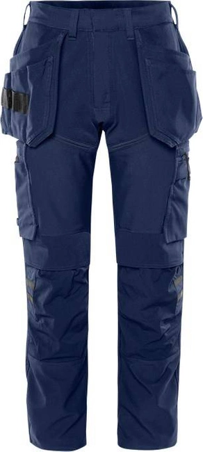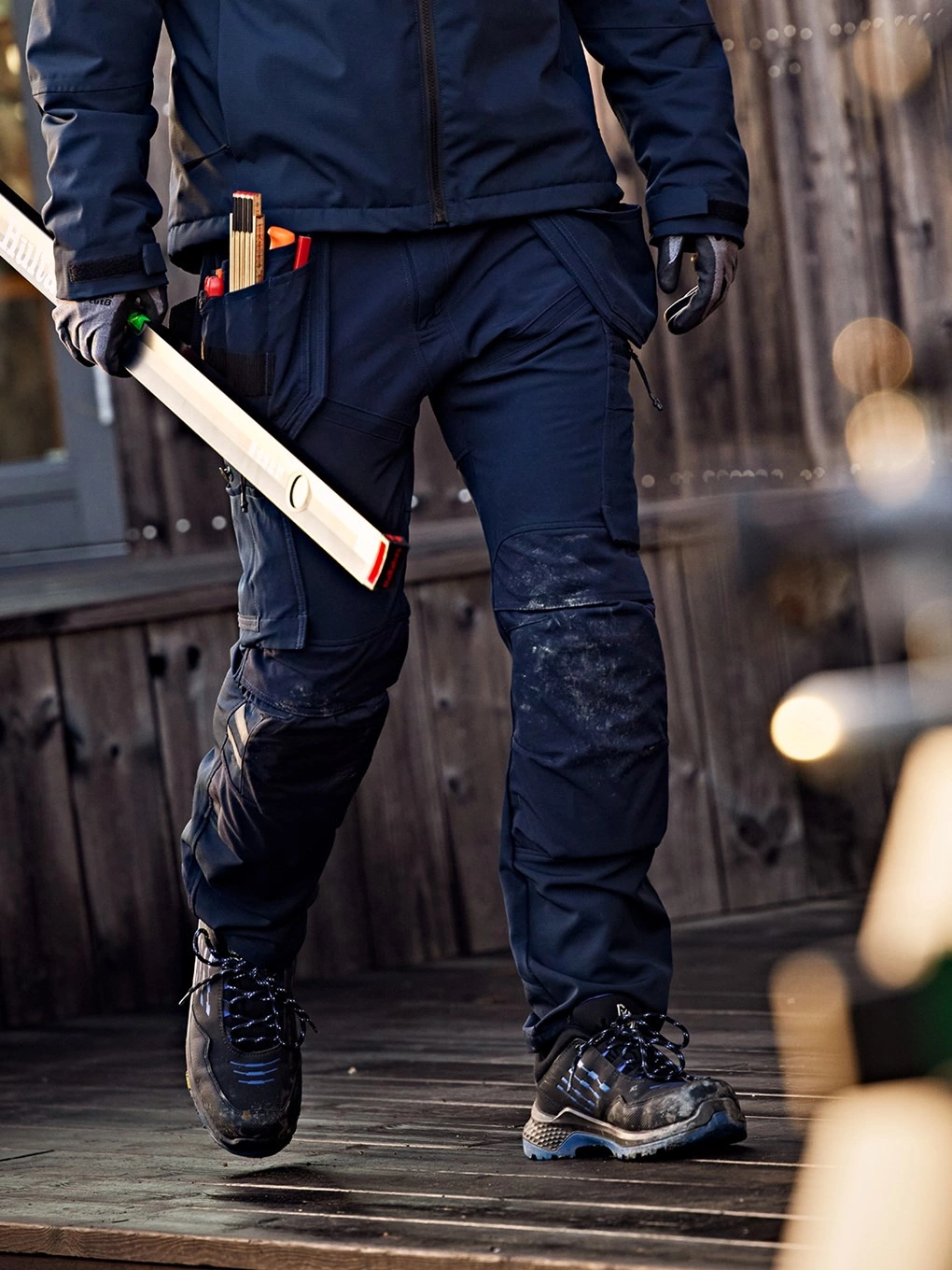Ukryty przedni guzik / 2 przednie kieszenie / 2 tylne kieszenie / 2 tylne kieszenie z zamkiem / Podwójnie wzmocniony szew krocza / Pętla młotka / Składana kieszeń rule w ripstop stretch, kieszeń na nogawki z zapięciem na zatrzask, kieszeń na zamek, kieszeń na długopis, 2 kieszenie narzędziowe oraz guzik i pętla na nóż / Kieszeń na nogawkę z zapięciem na rzep, kieszeń na zamek, kieszeń na telefon komórkowy i kieszeń na dowód osobisty z klapką, D-ring pod klapą / Ripstop rozciągliwe kieszenie kolanowe z zewnętrznym otworem od góry z zapięciem na rzep / Regulacja wysokości na nakolanniki w kieszeniach kolanowych / Odblaskowe detale na kolanach i końcach nóg / Wzmocnione końcówki nogawek Ripstop / Zatwierdzone zgodnie z EN 14404 wraz z nakolannikami 124292 / OEKO-TEX® certyfikowany.