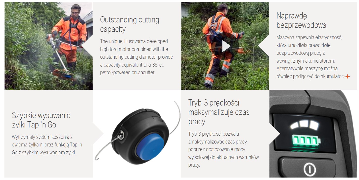 - Bezszczotkowy silnik E-TORQ: Opracowane przez firmę Husqvarna silniki E-TORQ są doskonale dostosowane do każdego zastosowania. Konstrukcja bezszczotkowa minimalizuje liczbę ruchomych części, a silniki są zbudowane tak, aby wytrzymać trudne, długotrwałe użytkowanie przez profesjonalistów. Są całkowicie bezobsługowe i będą działać przez cały okres użytkowania produktu.