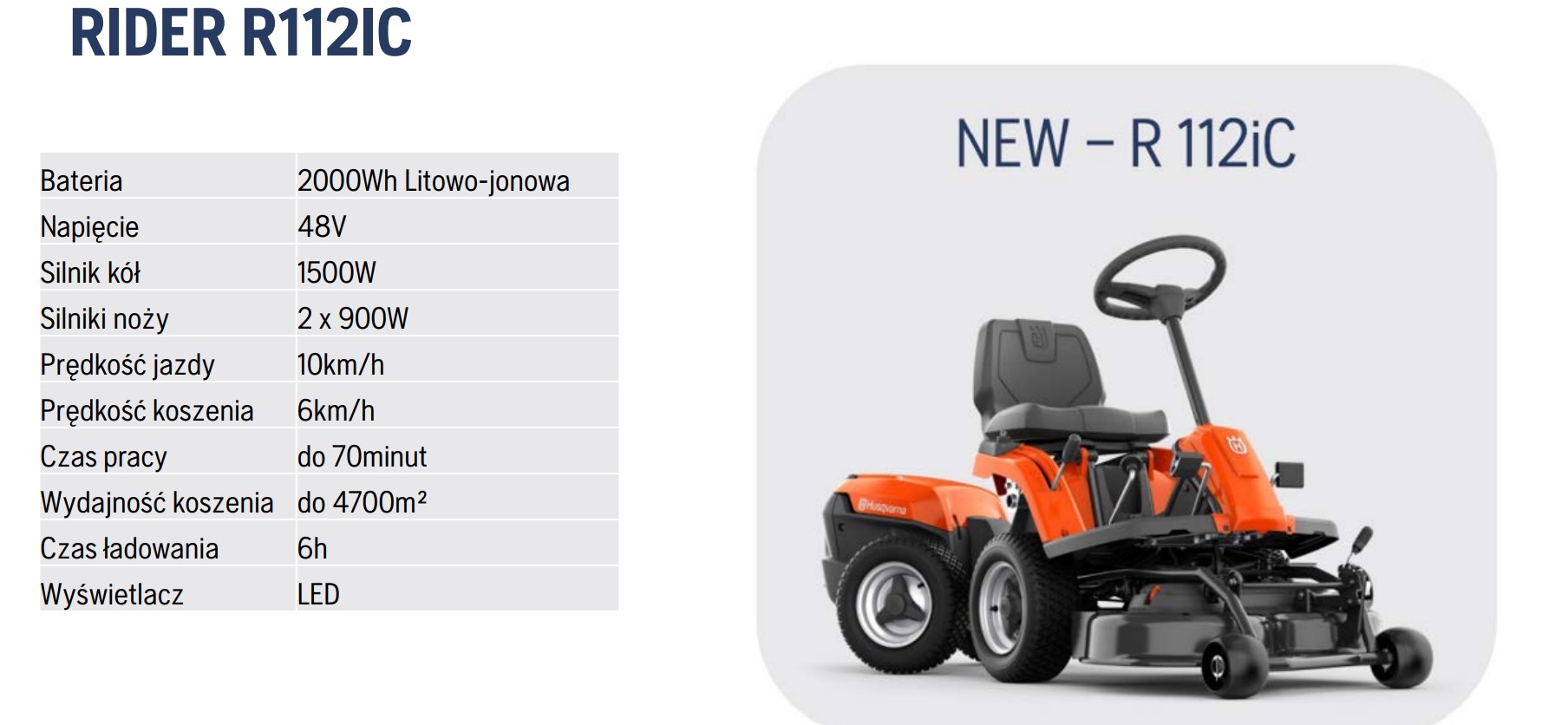 Rider R112iC to kosiarka samojezdna napędzana, dzięki akumulatorowi. Dzięki temu Rider jest nie tylko mocny, ale również bardzo cichy, a także nie wytwarza emisji spalin, a co za tym idzie nie wpływa negatywnie na środowisko naturalne. Wydajny silnik elektryczny i akumulator litowo-jonowy umożliwiają koszenie do 4700 m2 na jednym ładowaniu. Funkcja PowerBoost automatycznie ustawia optymalną wydajność, aby zapewnić doskonałe wyniki koszenia w każdych warunkach. Intuicyjne elementy sterujące takie jak, np.: łatwo dostępne dźwignie, ułatwiają obsługę, a przegubowy układ kierowniczy umożliwia skoszenie nawet trudno dostępnych miejsc, dzięki dużej zwrotności. Szereg akcesoriów kompatybilnych z tym modelem sprawia, że kosiarka ta staję się wielofunkcyjną maszyną wykorzystywaną przez cały rok.