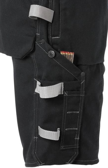 2 luźno wiszące kieszenie/ Jedna z 3 mniejszymi kieszeniami/ 2 przednie koszenie/ 2 boczne kieszenie jedna z zamkiem/ 2 tylne kieszenie/ Pętla na młotek/ Wielofunkcyjna kieszeń na nogawce/Kontrastowe szwy