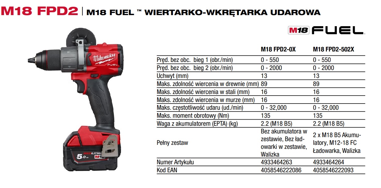 Wiertarko-wkrętarka udarowa Milwaukee M18FPD2-502C