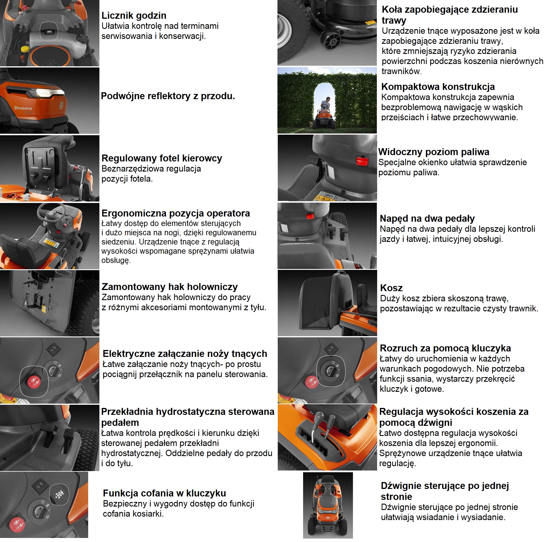 Traktory koszące marki Husqvarna posiadają wiele wygodnych i przydatnych funkcji ułatwiających ich użytkowanie. Szerokie koszenie, ergonomiczny fotel, kierownica i dźwignie zapewniają komfort jazdy. Rama drabinowa gwarantuję wytrzymałość na długie lata. Dodatkowe akcesoria takie jak, np.: przyczepka, lemiesz (pług) czy szczotka zmieniają traktory ogrodowe w urządzenia wielofunkcyjne. W ofercie znajdują się traktorki z wyrzutem bocznym lub zbieraniem do kosza, a także z różną szerokością koszenia oraz różną mocą.