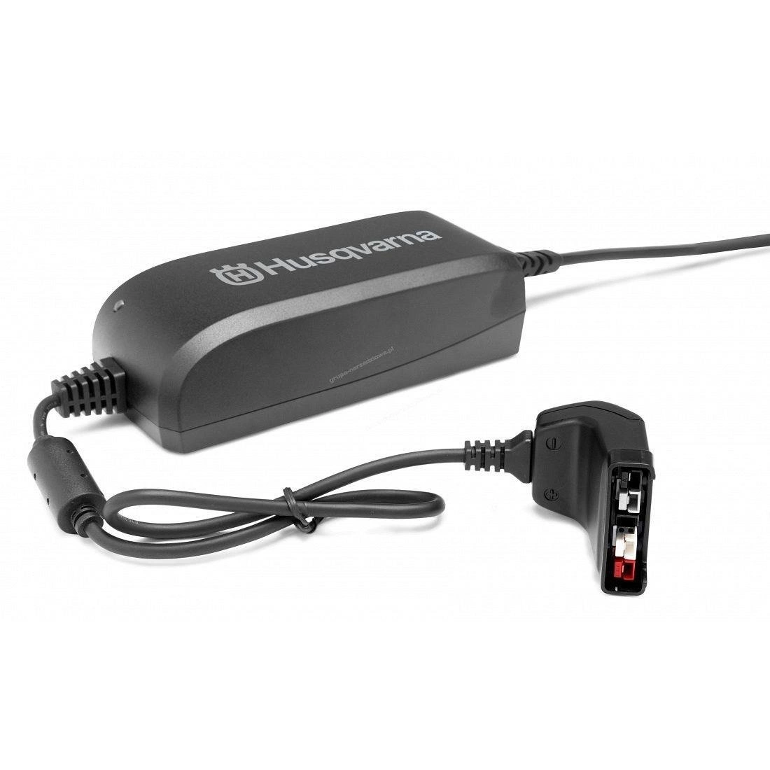 Kompaktowa ładowarka Husqvarna z gniazdem 220 V. Do bezpiecznego i wydajnego ładowania akumulatorów litowo jonowych BLi.