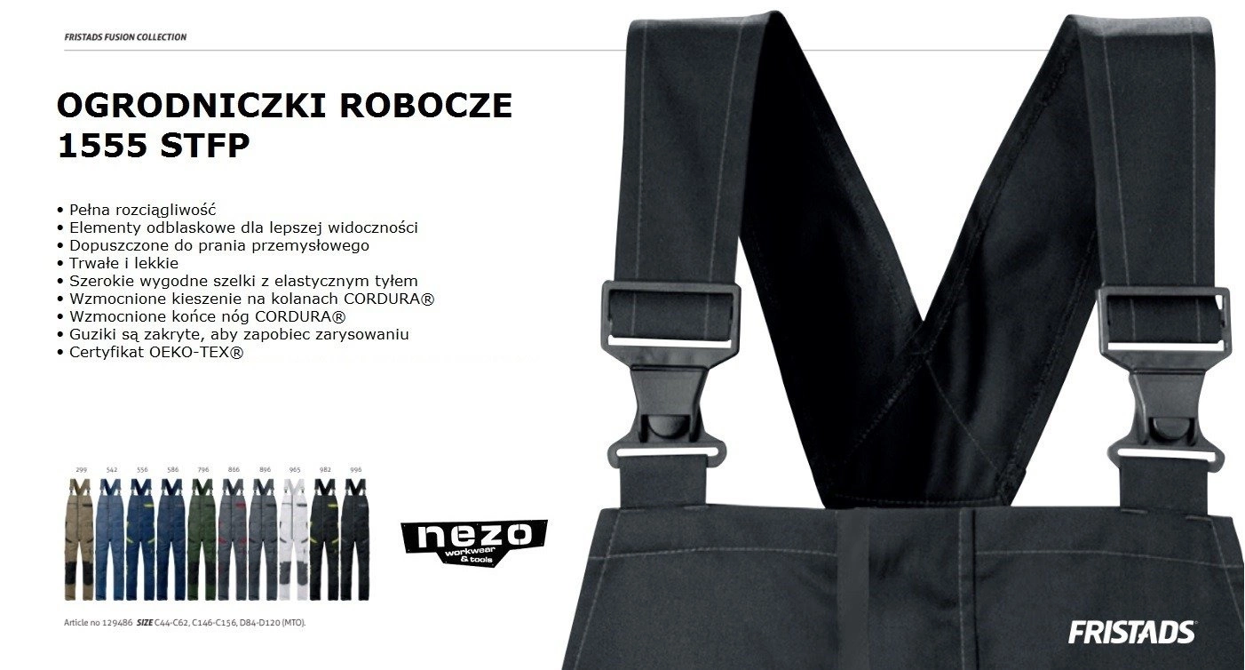 - Ogrodniczki ze współczesnym dopasowaniem dla pracowników z branży przemysłowej, usługowej lub budowlanej. Wykonane z lekkiego i wytrzymałego materiału z mechanicznym naciągiem, który zapewnia wygodną swobodę ruchów.
