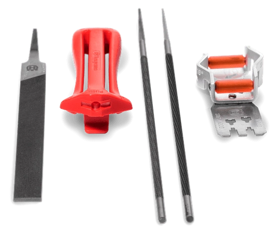 Kompletny zestaw do ostrzenia ułatwia utrzymanie łańcucha w dobrym stanie. Zestaw zawiera uchwyt pilnika, prowadnik z przymiarem lub prowadnik pilnika z szablonem ograniczników, dwa okrągłe pilniki i jeden pilnik płaski. Przeznaczony do łańcucha H35, H36 3/8" z rowkiem 1,3 mm.