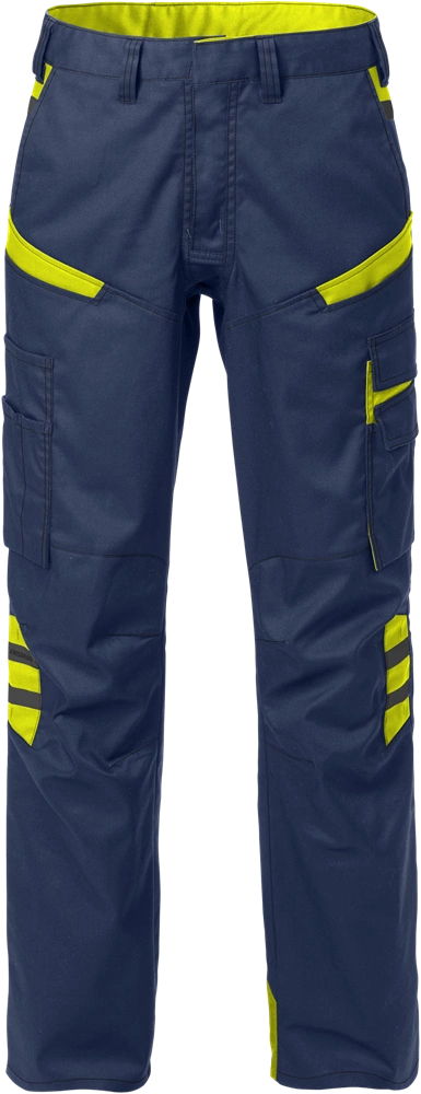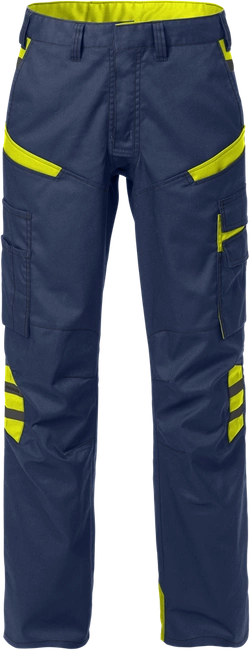 Elastyczny materiał / Ciemno-szare odblaskowe elementy / 2 kieszenie z przodu / 2 kieszenie z tyłu / Ukryty guzik z przodu / 2 kieszenie na udach / Dodatkowy szew w kroku / Kieszeń na nogawce z dodatkową kieszenią / Pętla na linijkę wewnątrz kieszeni na nogawce / Kieszeń na nogawce z klapką i zapięciem na rzep, kieszeń na telefon komórkowy i dodatkowa kieszeń z klapką i zapięcie na rzep, D-ring pod klapą / Wzmocnione końce nóg CORDURA® / Regulowana długość nogawek z 5 cm naddatkiem na dole / Przetestowane pod kątem prania zgodnie z ISO 15797 / Z EPD (deklaracją środowiskową produktu) – numer rejestracyjny 1701 na environdec.com / Certyfikat OEKO-TEX®